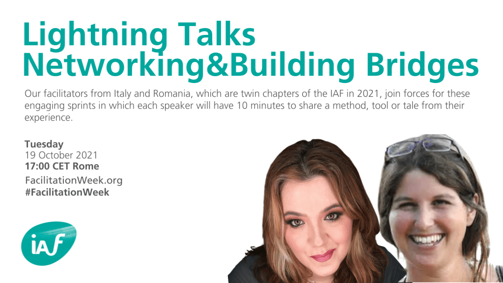 La Facilitation Week è un evento che si svolge ogni anno con l’obiettivo di diffondere il potere della facilitazione e creare un senso di comunità tra i facilitatori (professionisti, aspiranti e curiosi) in tutto il mondo. Sono disponibili più di 80 workshop e seminari e durante questa edizione IAF Italia organizza insieme al chapter Romania il “Lightning Talk”: un evento aperto a tutti, con il modello Conversazioni Lampo” per condividere metodi e strumenti. Il tema sarà “networking and building bridges”